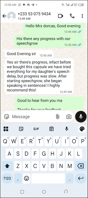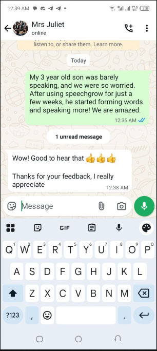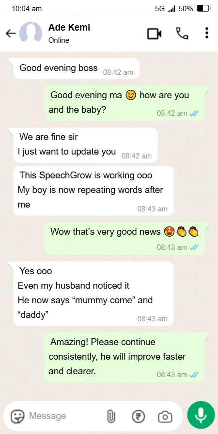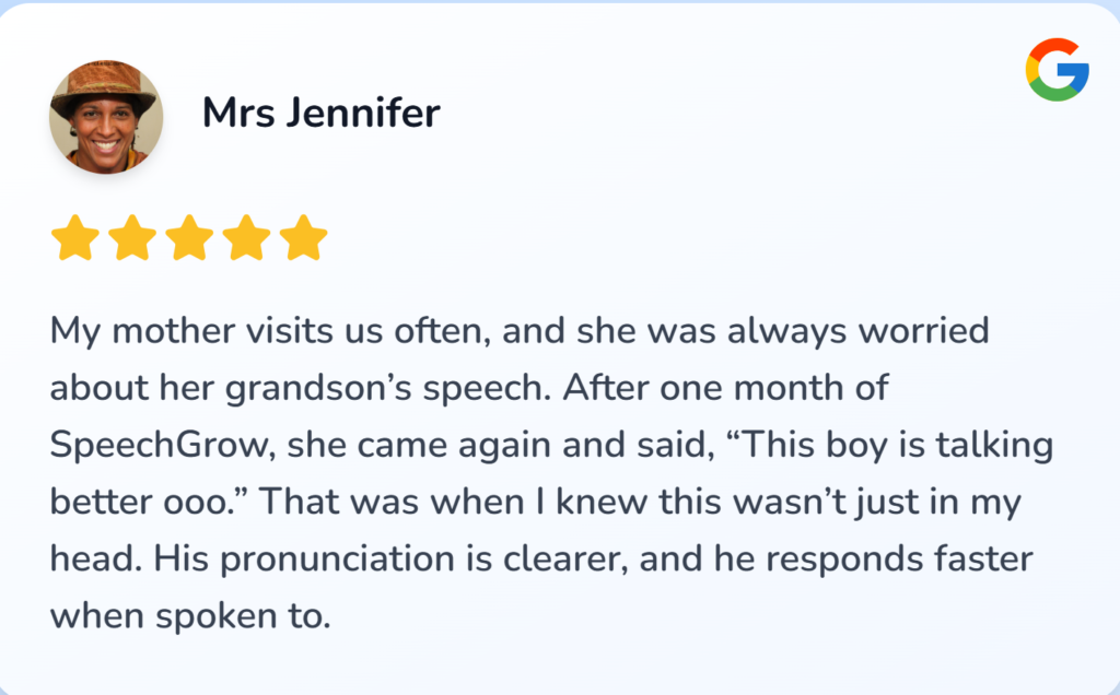 I felt helpless and blamed myself sometimes. I started SpeechGrow after someone recommended it. Within 2–3 weeks, he began repeating simple words. By the end of the first bottle, he started saying “Daddy come” and “Mummy help.”